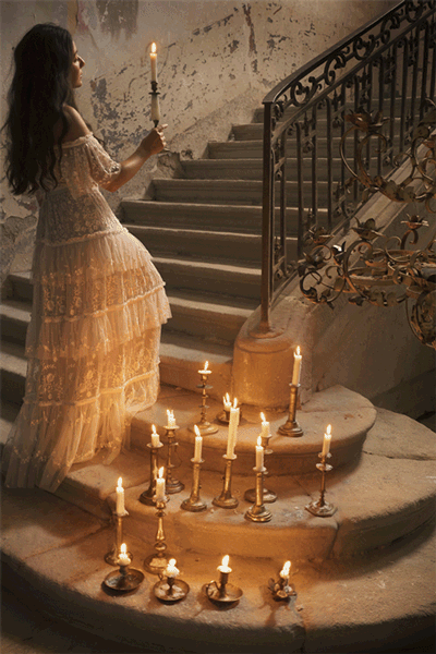 I saved my favorite for last: a beautiful setting, model, idea, and composition. Each piece of this puzzle comes together smoothly and elegantly, from the soft lace on the dress to the delicate flickering of the candles to the clearly once-loved staircase and lovely handrails. The flickering of the candles is an excellent choice for adding living movement because adding motion to her hair or dress would be too distracting in this piece.