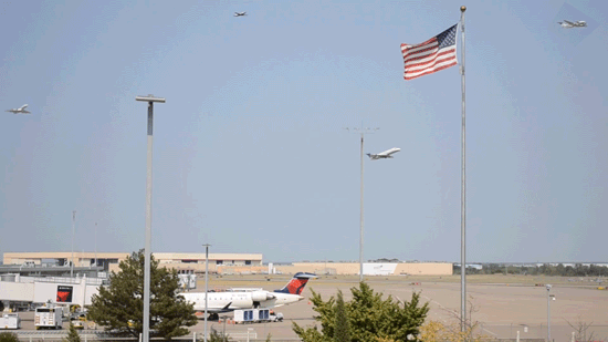 In the second cinemagraph from this takeoff video, I wanted only the flag to move. So, in a new project file in AfterEffects, I scrubbed the large airplane video to find a still image where the plane is close to the flag. From my other three videos of small planes, I used still images where the planes were near the screen borders. Then, I created masks in each of the small plane stills to show only the individual planes. Finally, with the larger plane image, I made a mask to encompass everything on the screen, except for the area around the flag.