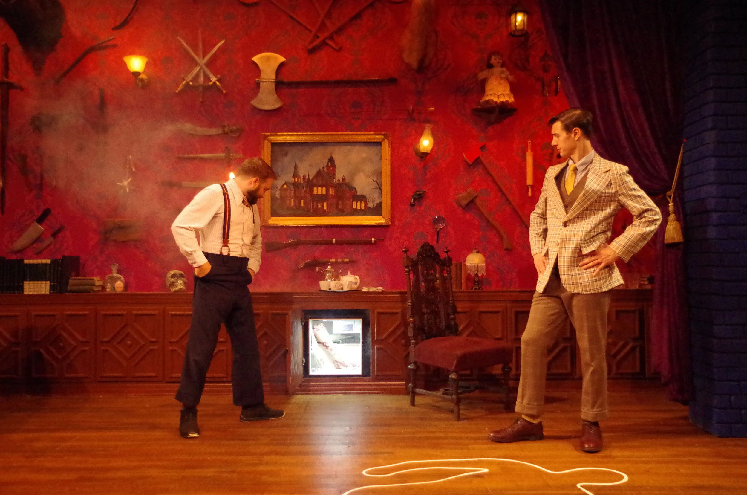 The Suspects and the Detective looking at a freezer with a severed foot, with the weaponry wall behind them.